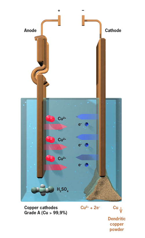 By electrolysis we produce dendritic copper powders: Thereby due to process parameters and preparation we can offer a wide range of different grades from light apparent density (AD) (0,7 g/cm3) up tp heavy grades (3,0 g/cm3).